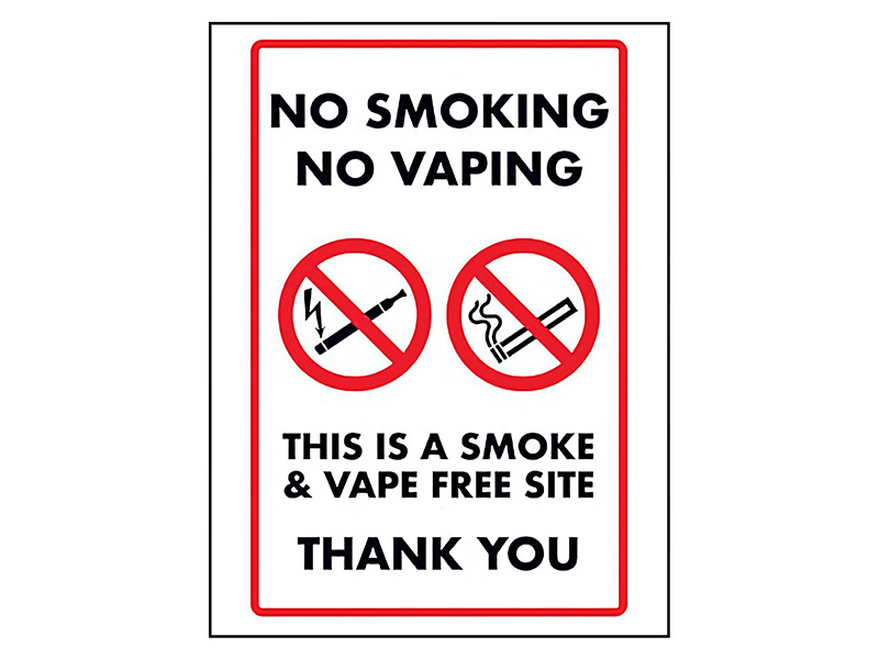 Easy-to-Read Text: Bold, large-scale sans-serif lettering states “No Smoking No Vaping, This is a smoke & vape free site, Thank you,” maximising readability and reducing ambiguity.